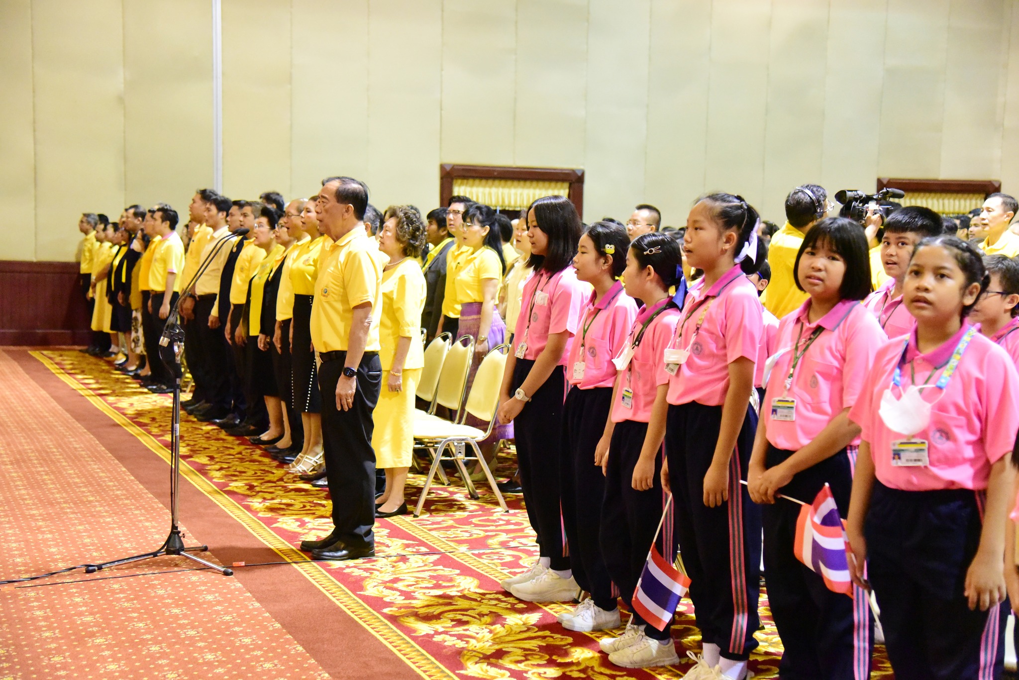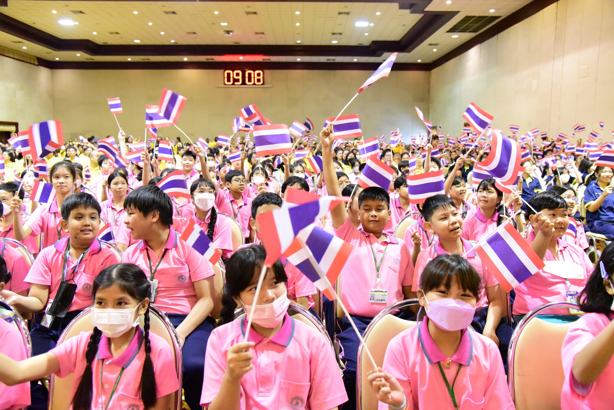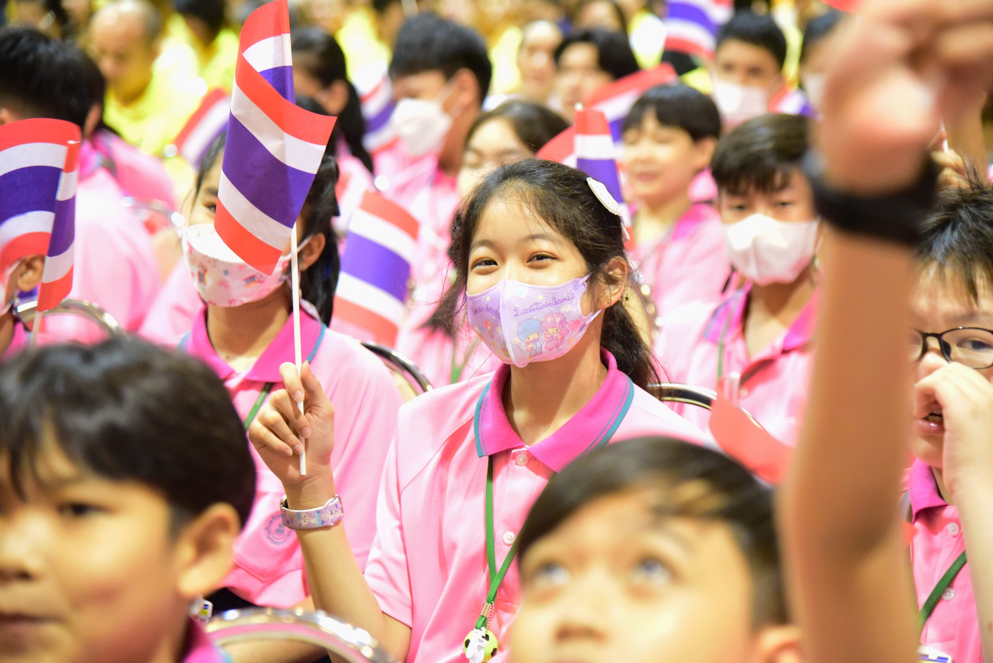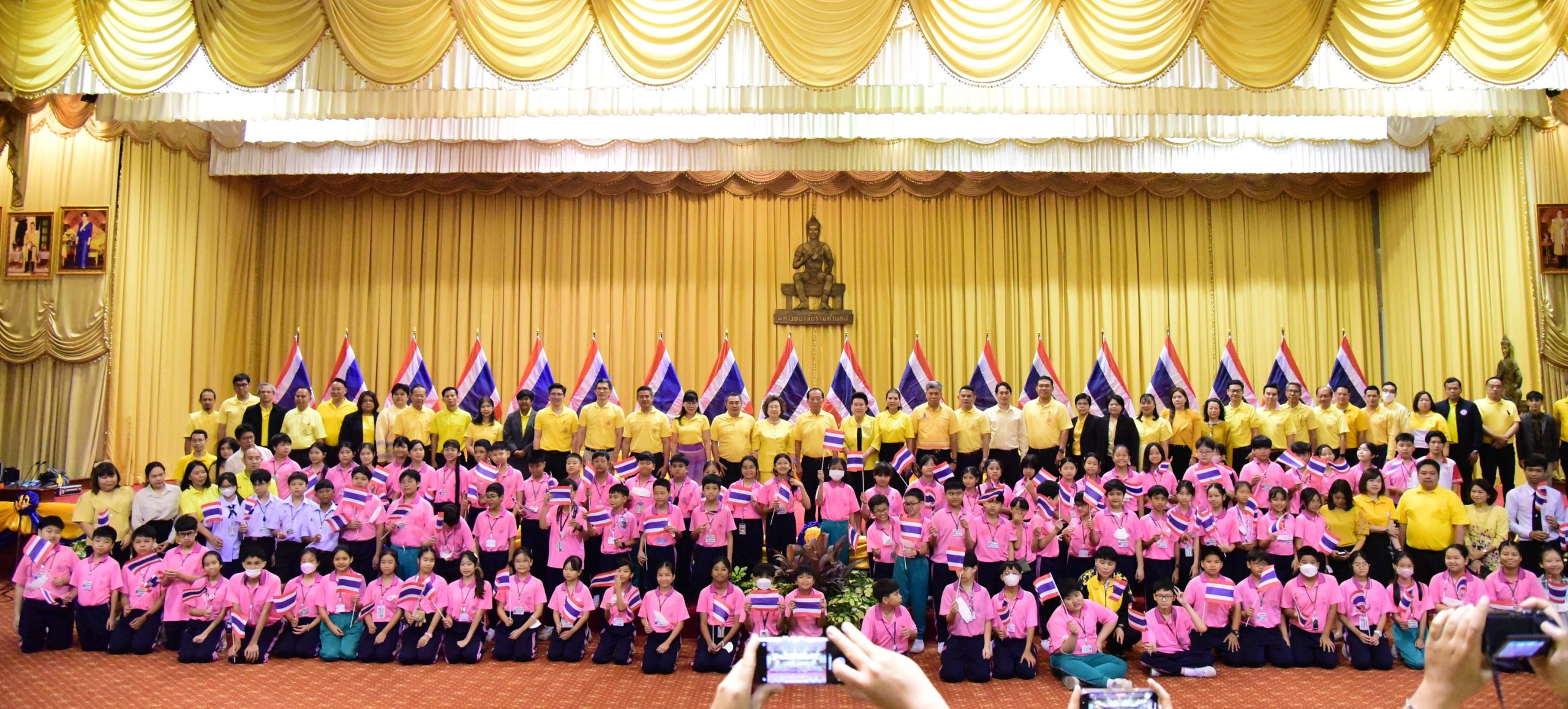 และนักเรียนโรงเรียนสาธิตมหาวิทยาลัยรามคำแหง ร่วมร้องเพลงชาติไทยเพื่อให้กำลังใจทหาร เจ้าหน้าที่ อาสาสมัคร