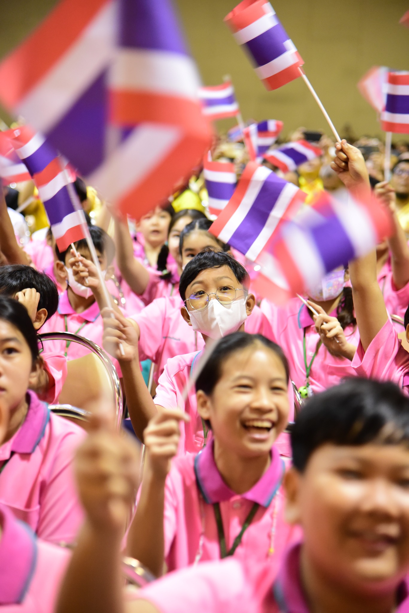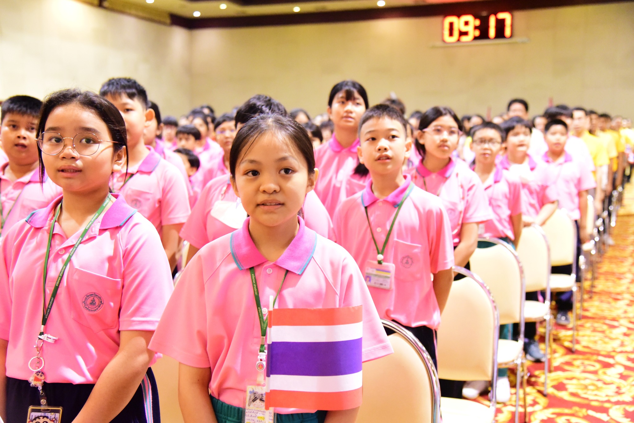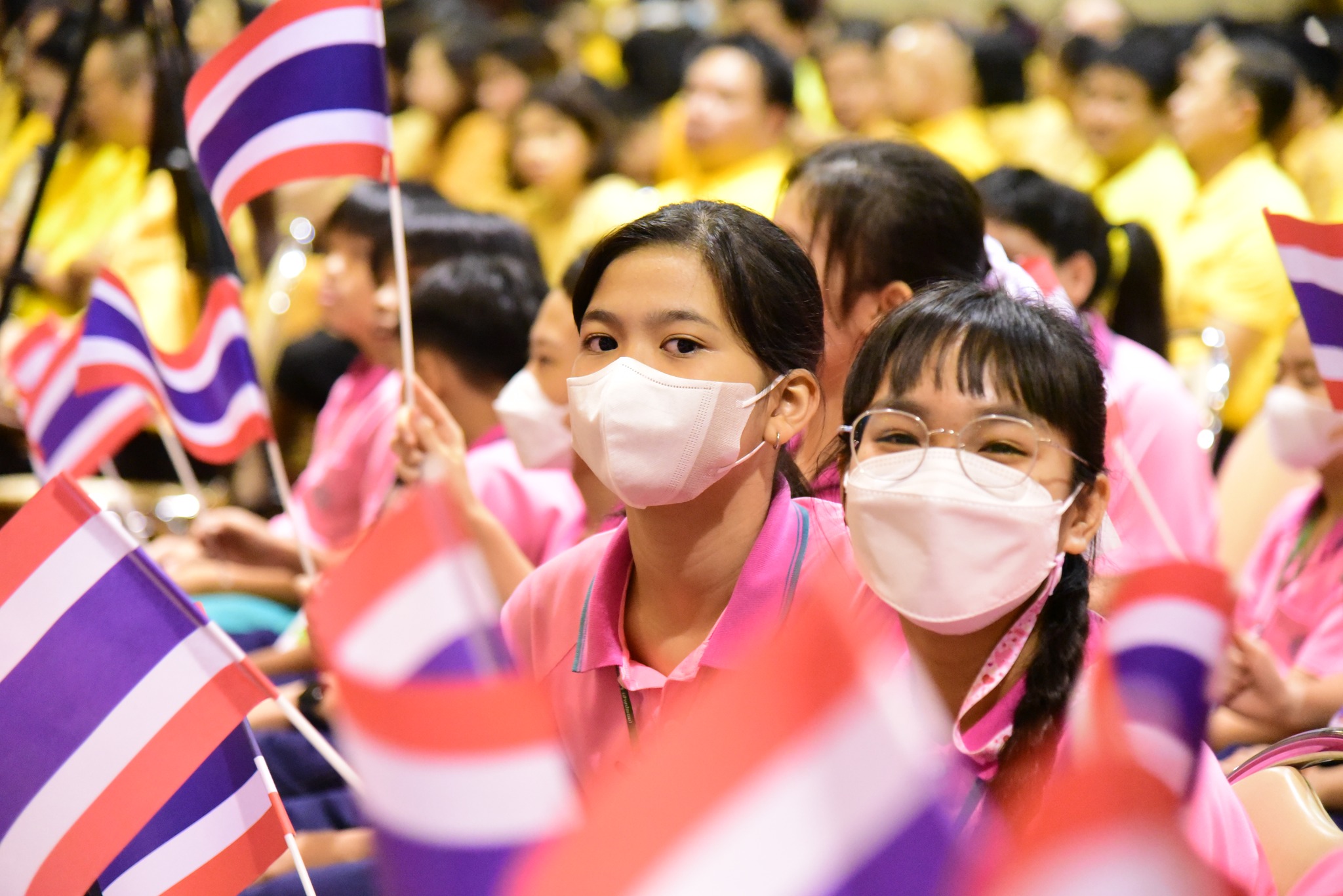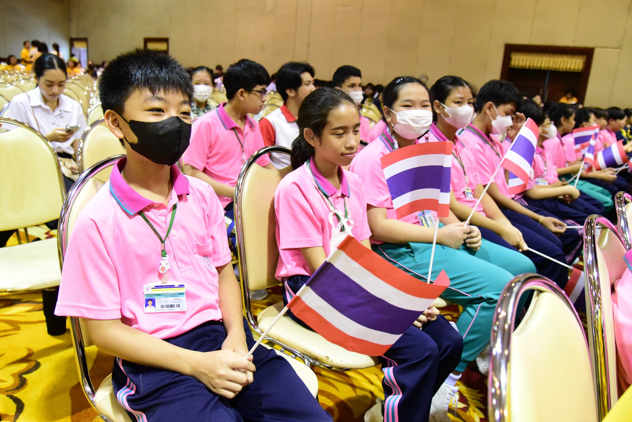 และนักเรียนโรงเรียนสาธิตมหาวิทยาลัยรามคำแหง ร่วมร้องเพลงชาติไทยเพื่อให้กำลังใจทหาร เจ้าหน้าที่ อาสาสมัคร