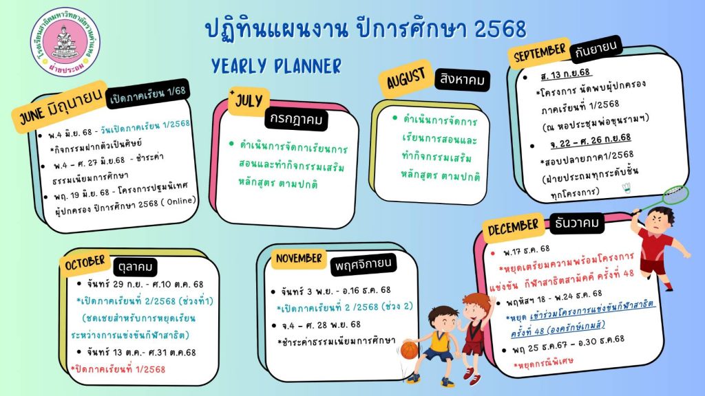 * เปิดภาคเรียนที่ 2/2568 (ช่วงที่1) * (จันทร์ 29 ก.ย. - ศุกร์ 10 ต.ค. 2568) |