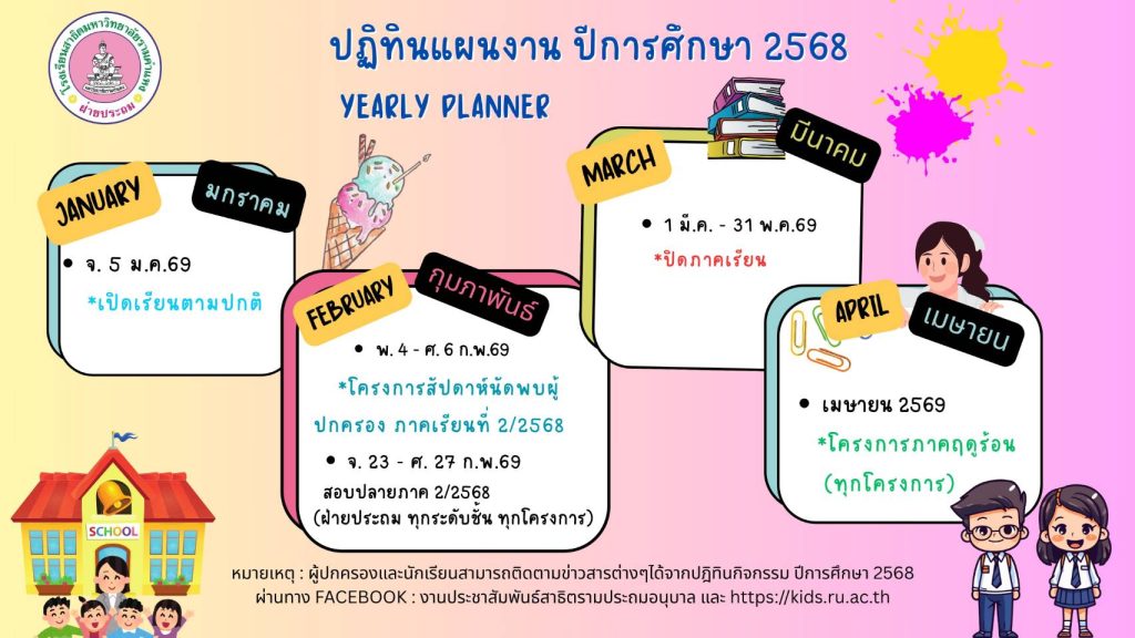 เปิดภาคเรียนที่ 2/2568 (ช่วงที่ 3 ) จันทร์ 5 ม.ค. 2569 - ศุกร์ 27 ก.พ. 2569 |