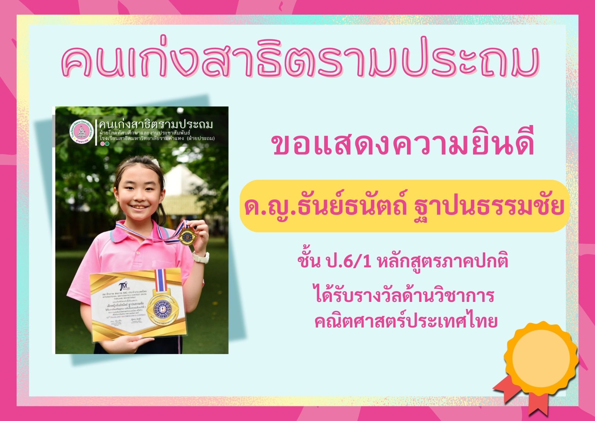 ด.ญ.ธันย์ธนัตถ์ ฐาปนธรรมชัย ชั้น ป.6/1 หลักสูตรภาคปกติ