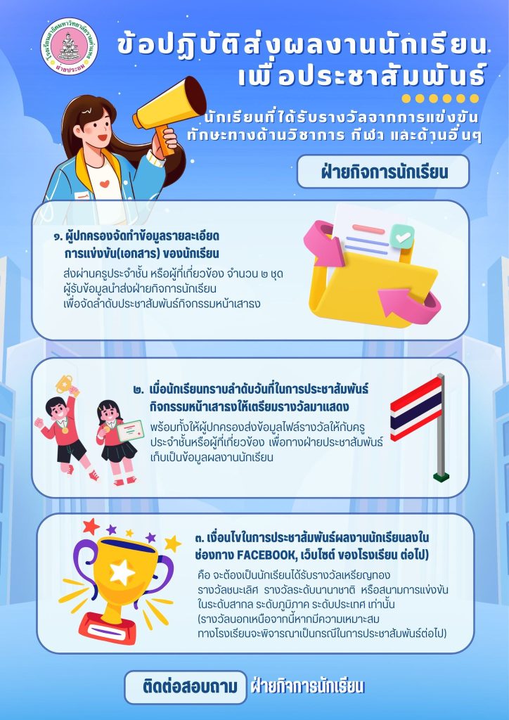 ประกาศโรงเรียน Posted on มิถุนายน 4, 2025มิถุนายน 4, 2025 by kids ⭐ ประชาสัมพันธ์ ⭐ ข้อปฏิบัติการส่งผลงานนักเรียนเพื่อประชาสัมพันธ์โดยฝ่ายกิจการนักเรียน