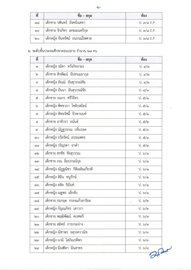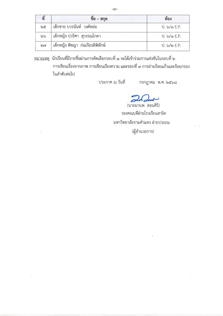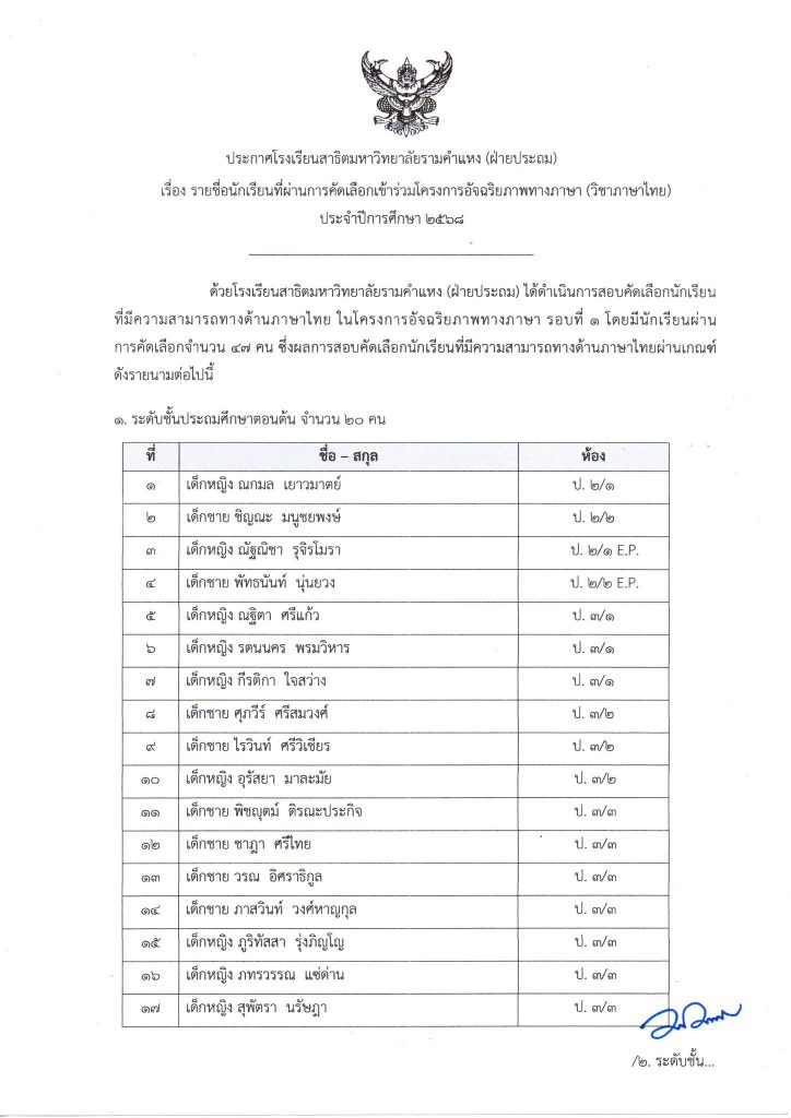 ประกาศรายชื่อนักเรียนที่ผ่านการคัดเลือก