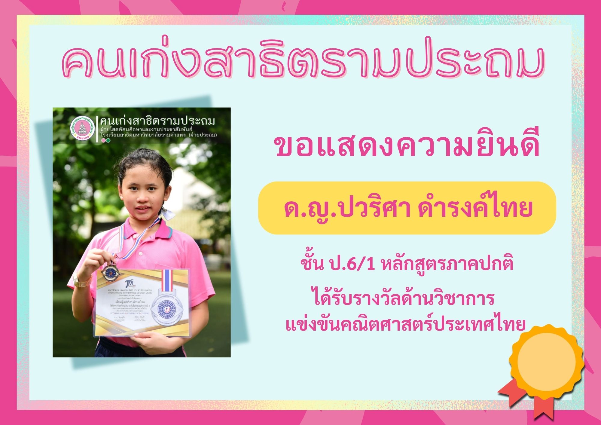 ด.ญ.ปวริศา ดำรงค์ไทย ชั้น ป.6/1 หลักสูตรภาคปกติ
