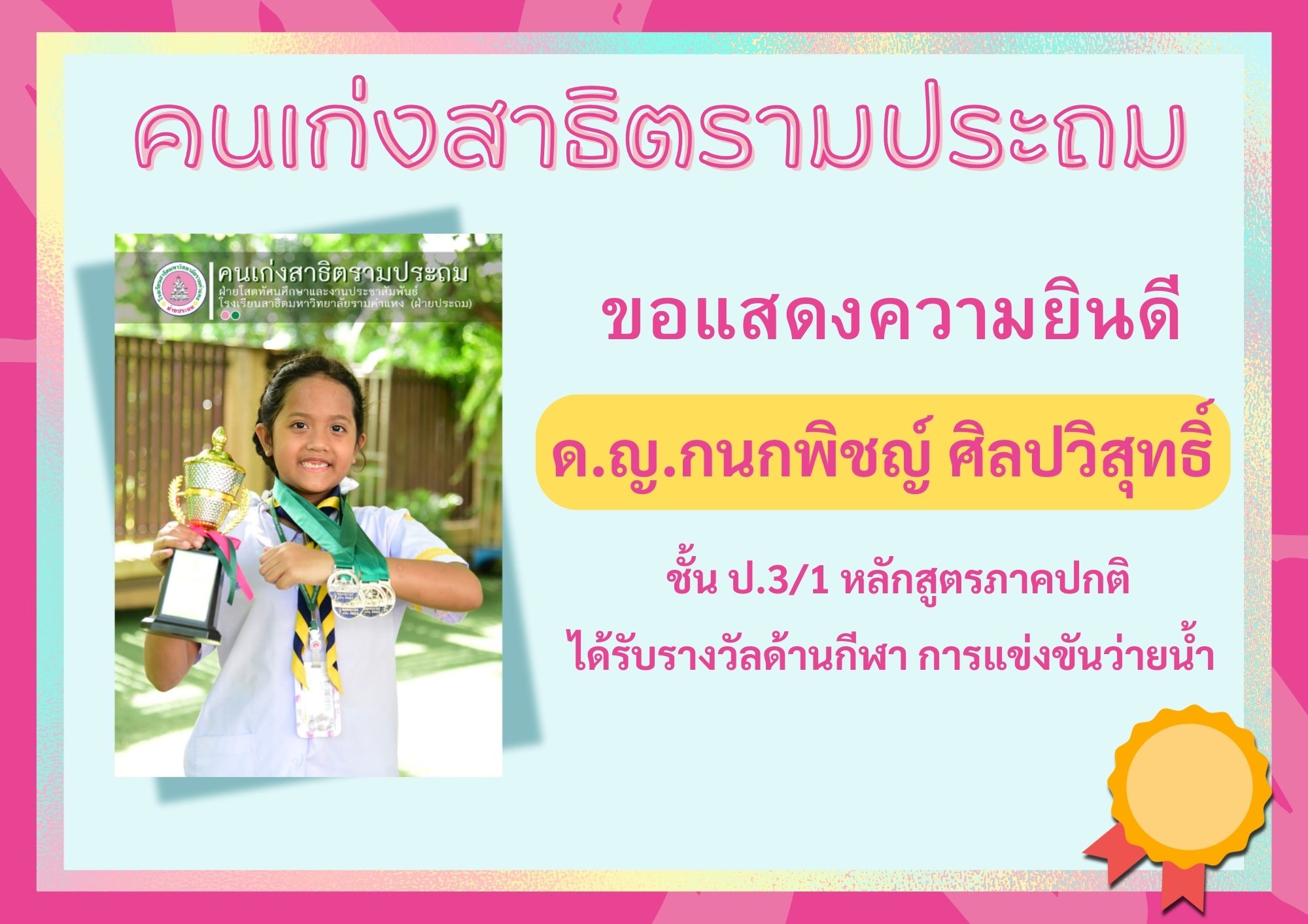 • ถ้วยรางวัลนักกีฬายอดเยี่ยม ชนะเลิศอันดับ 6 รุ่นอายุ 9 ปีหญิง