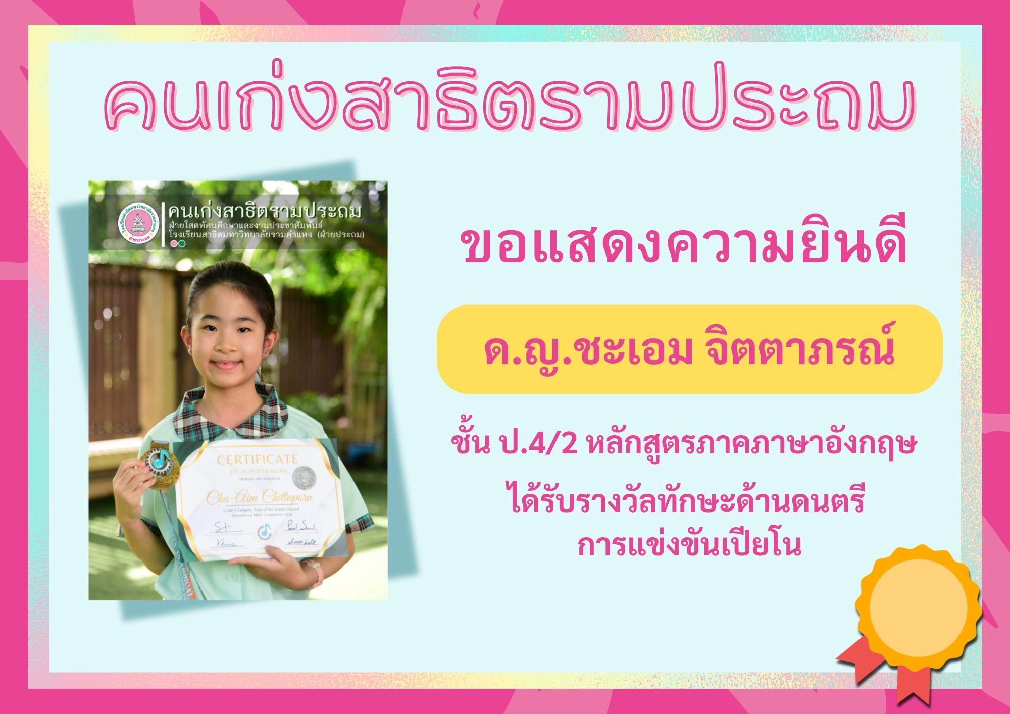 ด.ญ.ชะเอม จิตตาภรณ์ ชั้น ป.4/2 หลักสูตรภาคภาษาอังกฤษ