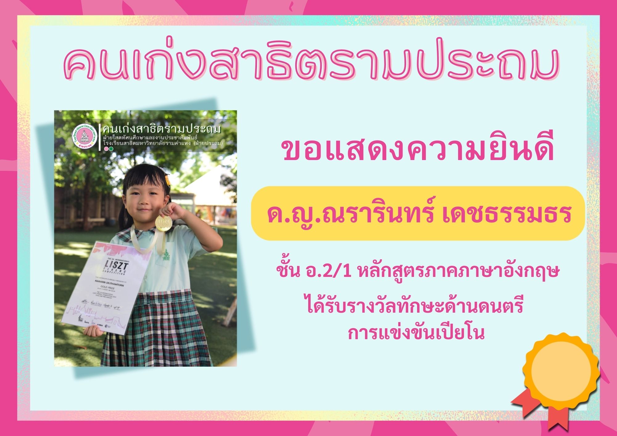 ได้รับรางวัลทักษะด้านดนตรี การแข่งขันเปียโน