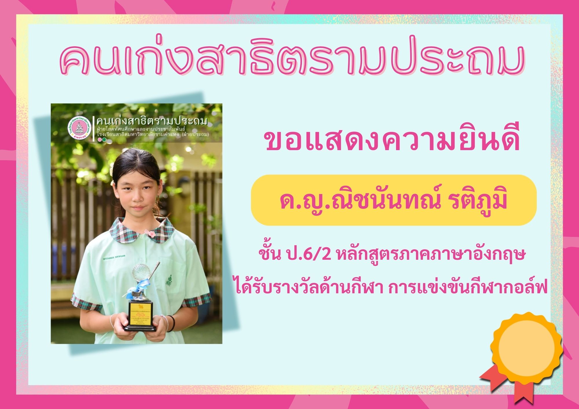 ด.ญ.ณิชนันทณ์ รติภูมิ ชั้น ป.6/2 หลักสูตรภาคภาษาอังกฤษ