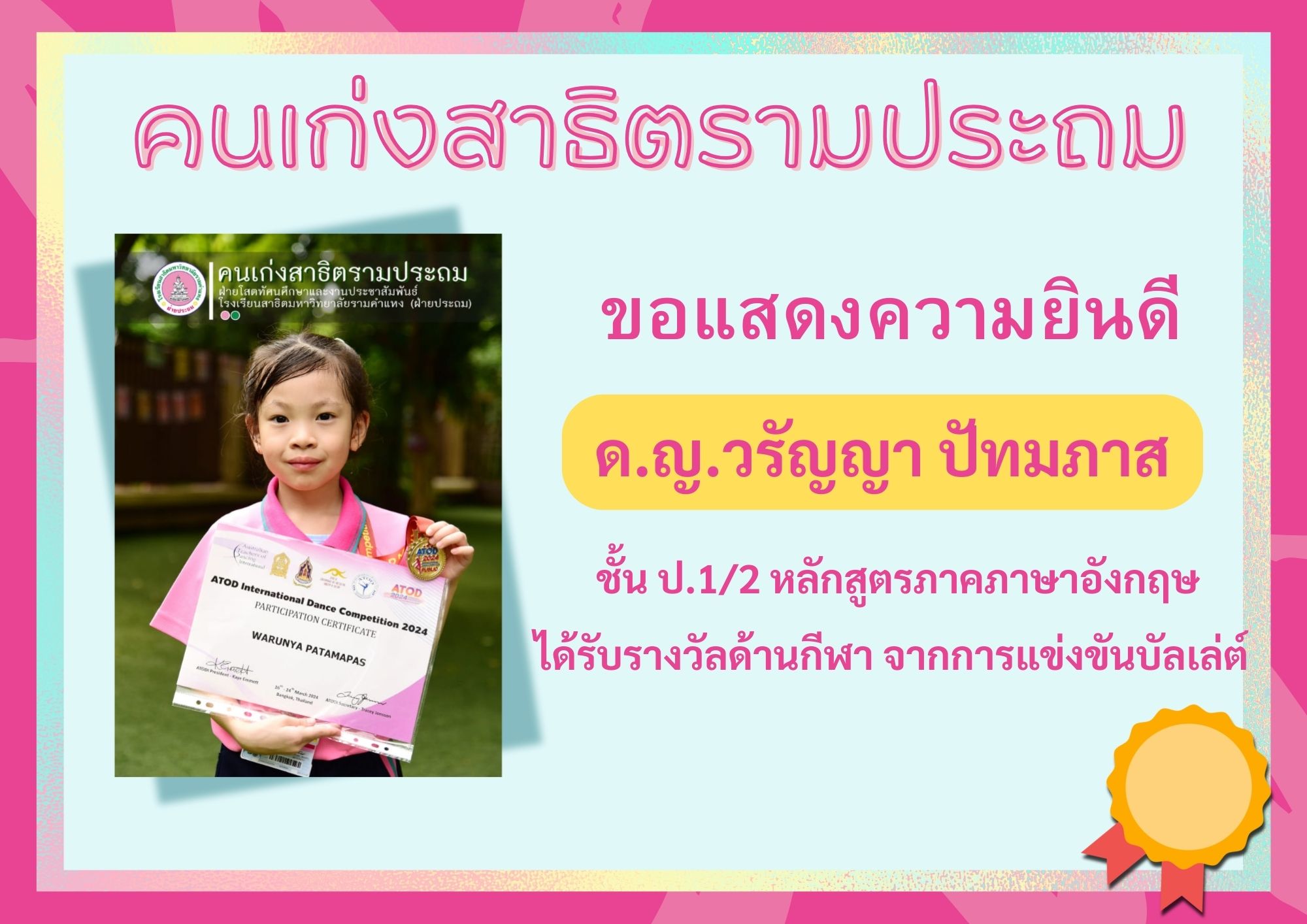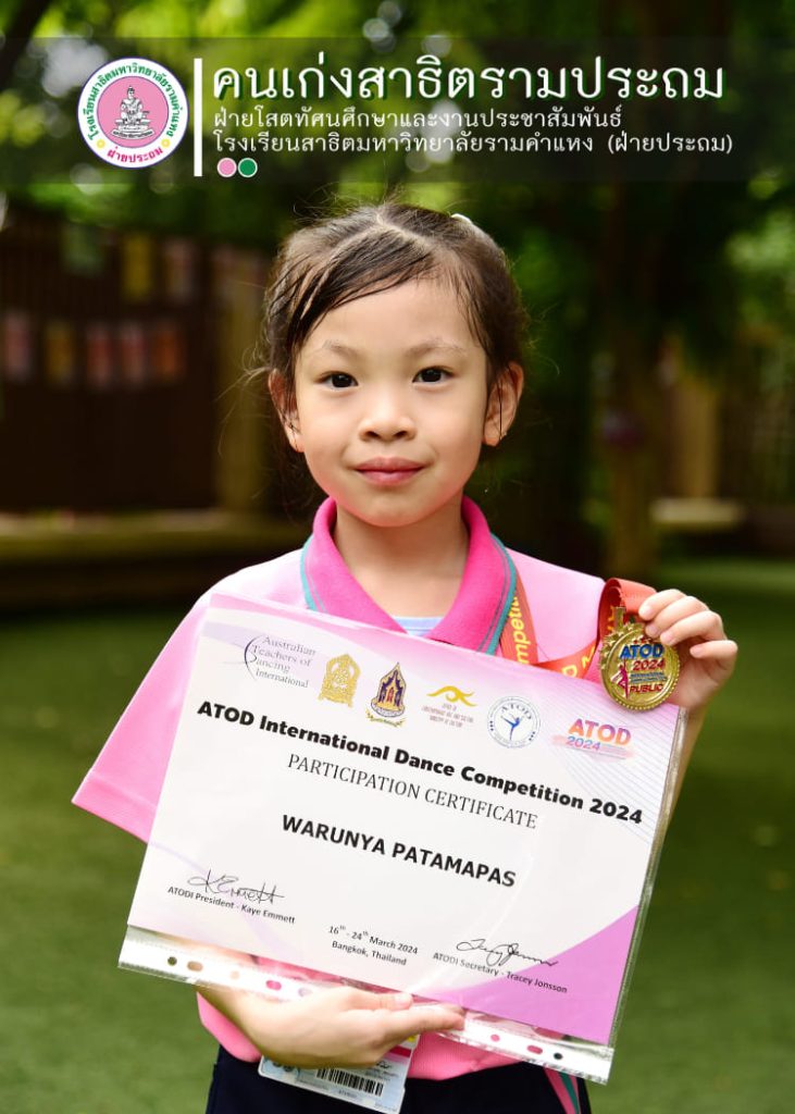 srisatit_2567 Posted on ตุลาคม 1, 2024ตุลาคม 1, 2024 by kids ด.ญ.วรัญญา ปัทมภาส ชั้น ป.1/2 หลักสูตรภาคภาษาอังกฤษ ได้รับรางวัลด้านกีฬา จากการแข่งขันบัลเล่ต์ ได้รางวัล GOLD MEDAL จากการเข้าร่วมแข่งขันบัลเล่ต์ รายการ ATOD International Dance Competition 2024 เมื่อวันที่ 18 มีนาคม 2567 รูปภาพเพิ่มเติม