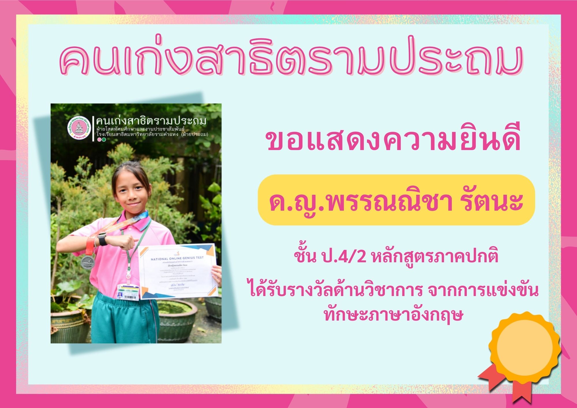 ได้รับรางวัลเหรียญเงิน จากโครงการสอบแข่งขันวัดอัจฉริยภาพทางวิชาการภาษาอังกฤษ