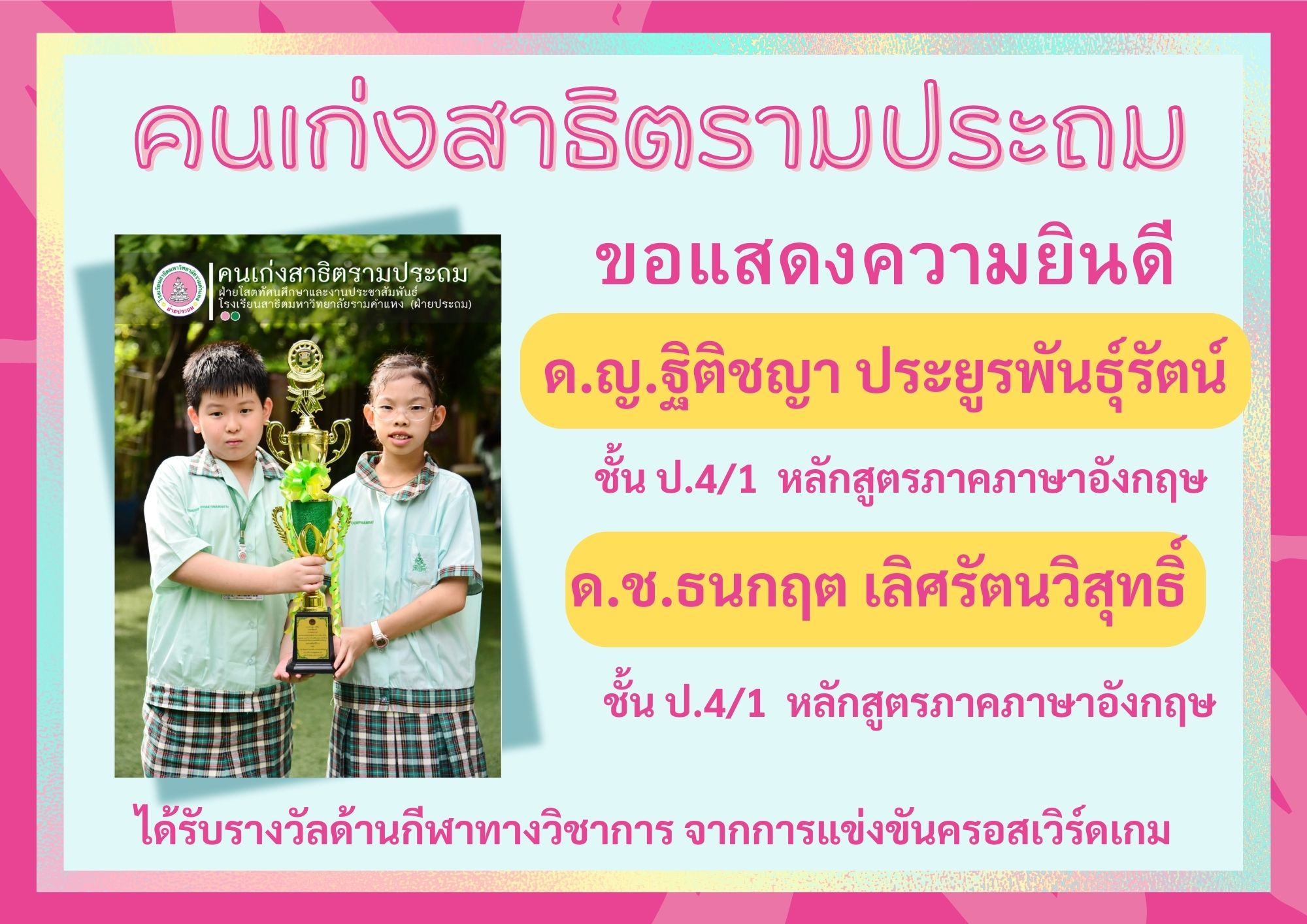 ได้รับรางวัลชนะเลิศ ประเภทครอสเวิร์ดเกม เกมต่อศัพท์ภาษาอังกฤษ รุ่นประถมศึกษาปีที่ 3-4