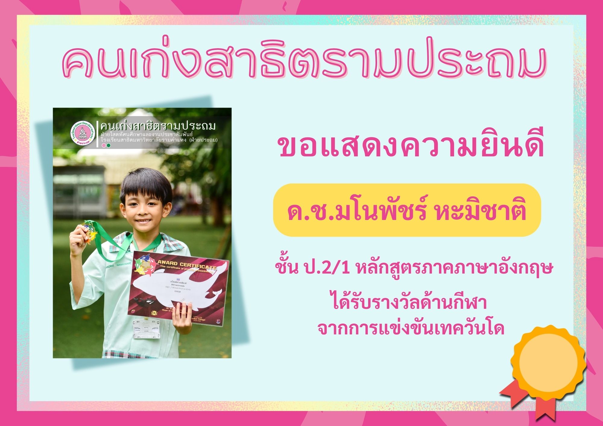 ได้รับรางวัลด้านกีฬา จากการแข่งขันเทควันโด
