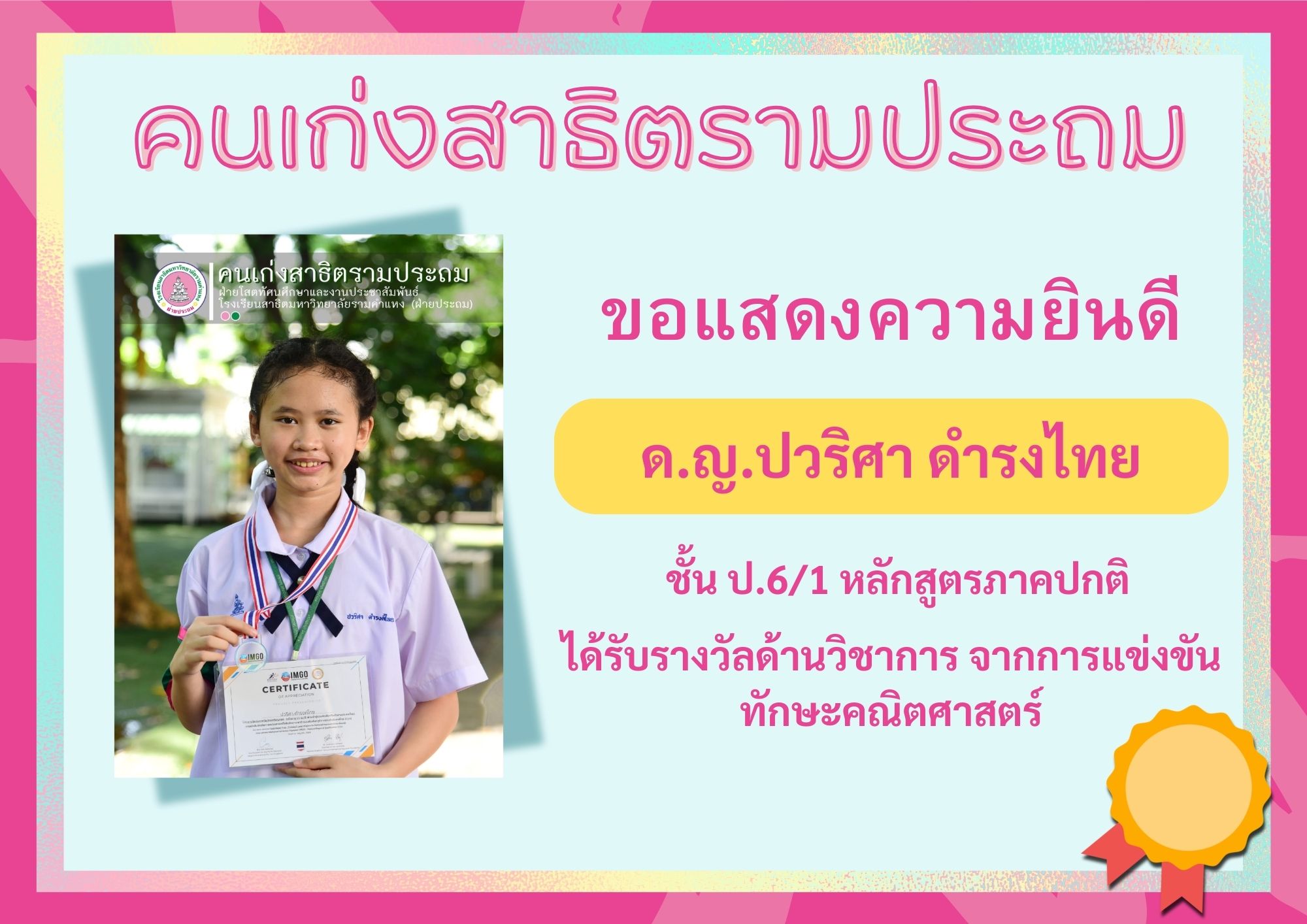 ด.ญ.ปวริศา ดำรงไทย ชั้น ป.6/1 หลักสูตรภาคปกติ