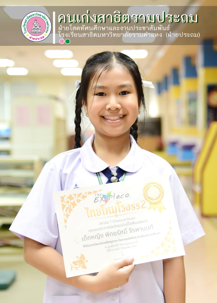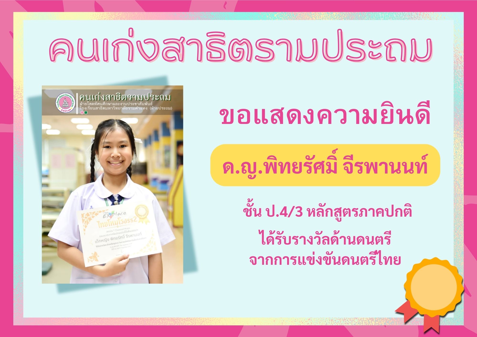 ได้รับรางวัลระดับเหรียญทอง จากการประกวดดนตรีไทยประเภทเดี่ยว (ระดับประถมและมัธยมศึกษา)