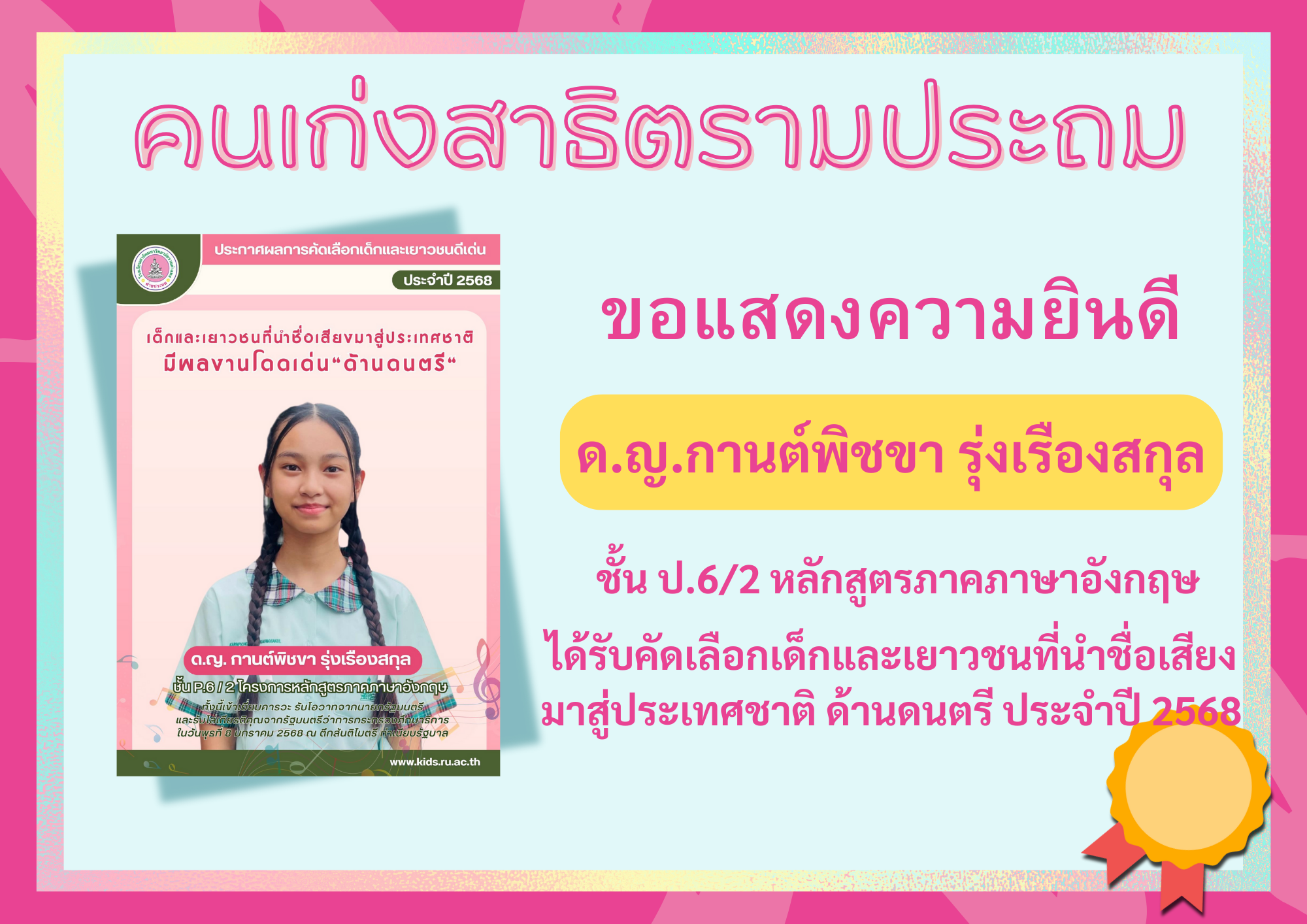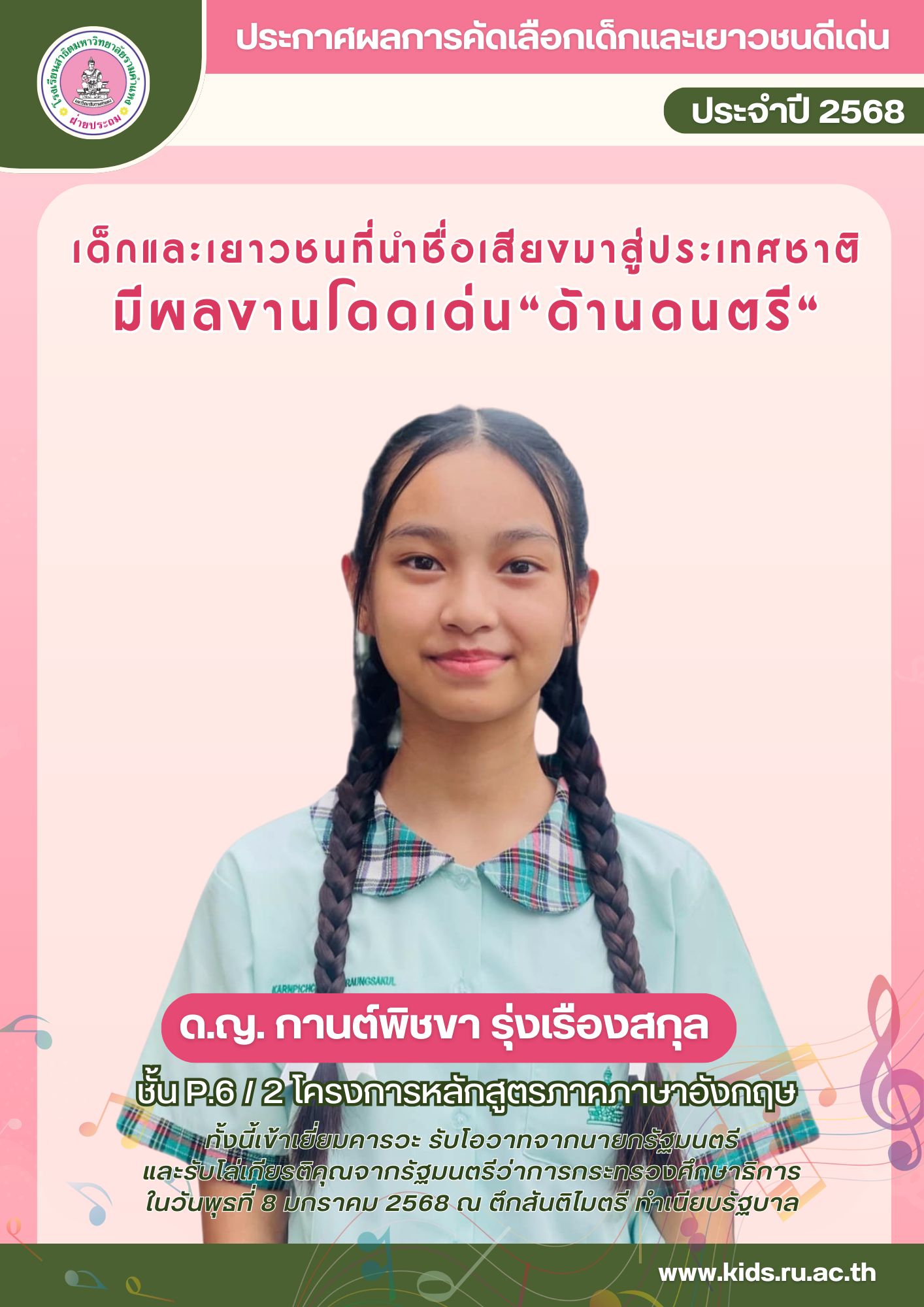 ได้รับคัดเลือกเด็กและเยาวชนที่นำชื่อเสียงมาสู่ประเทศชาติ ด้านดนตรี ประจำปี 2568