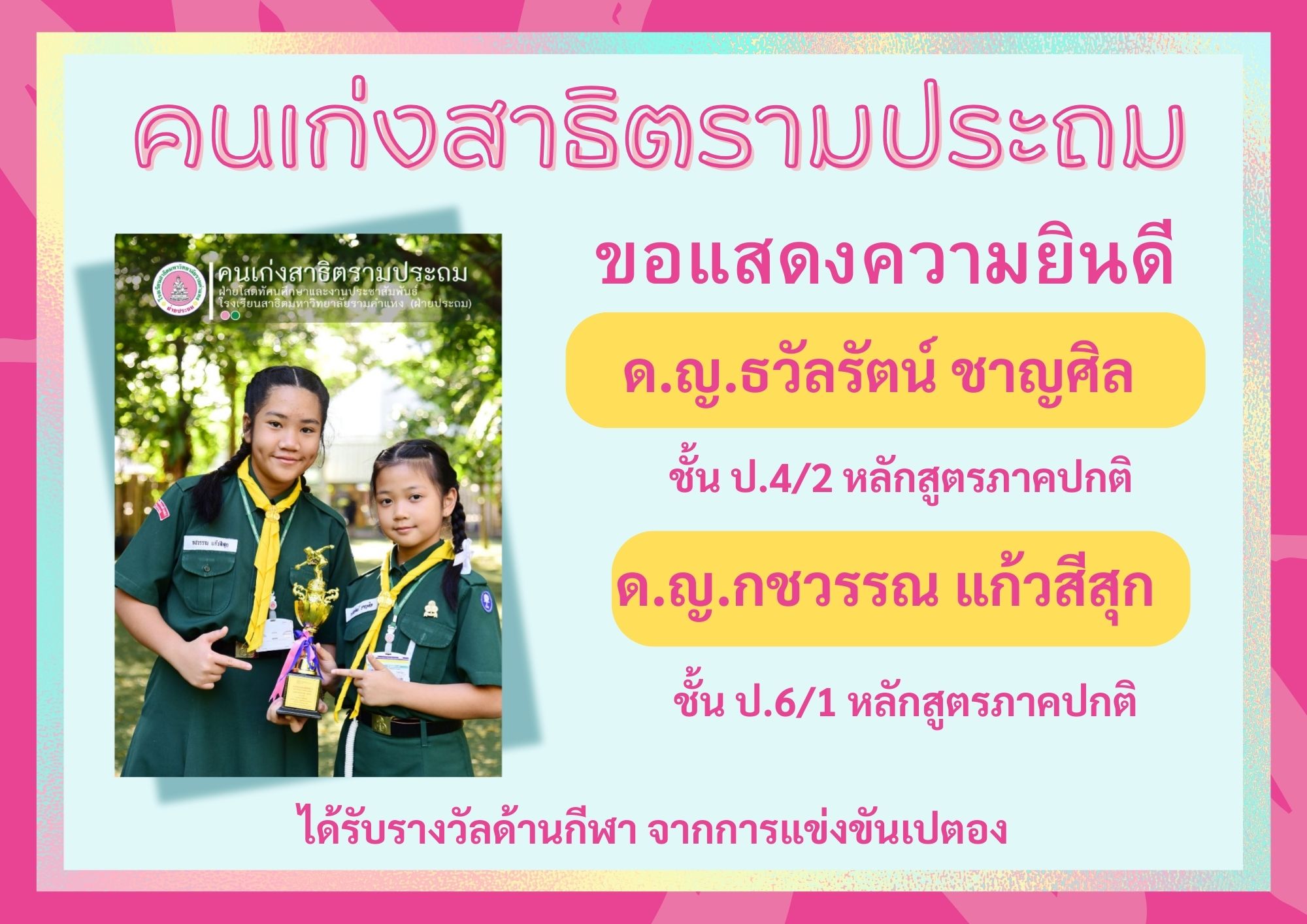 ได้รับรางวัลรองชนะเลิศอันดับ 2 ประเภทหญิงคู่ ระดับมัธยมศึกษาตอนต้น