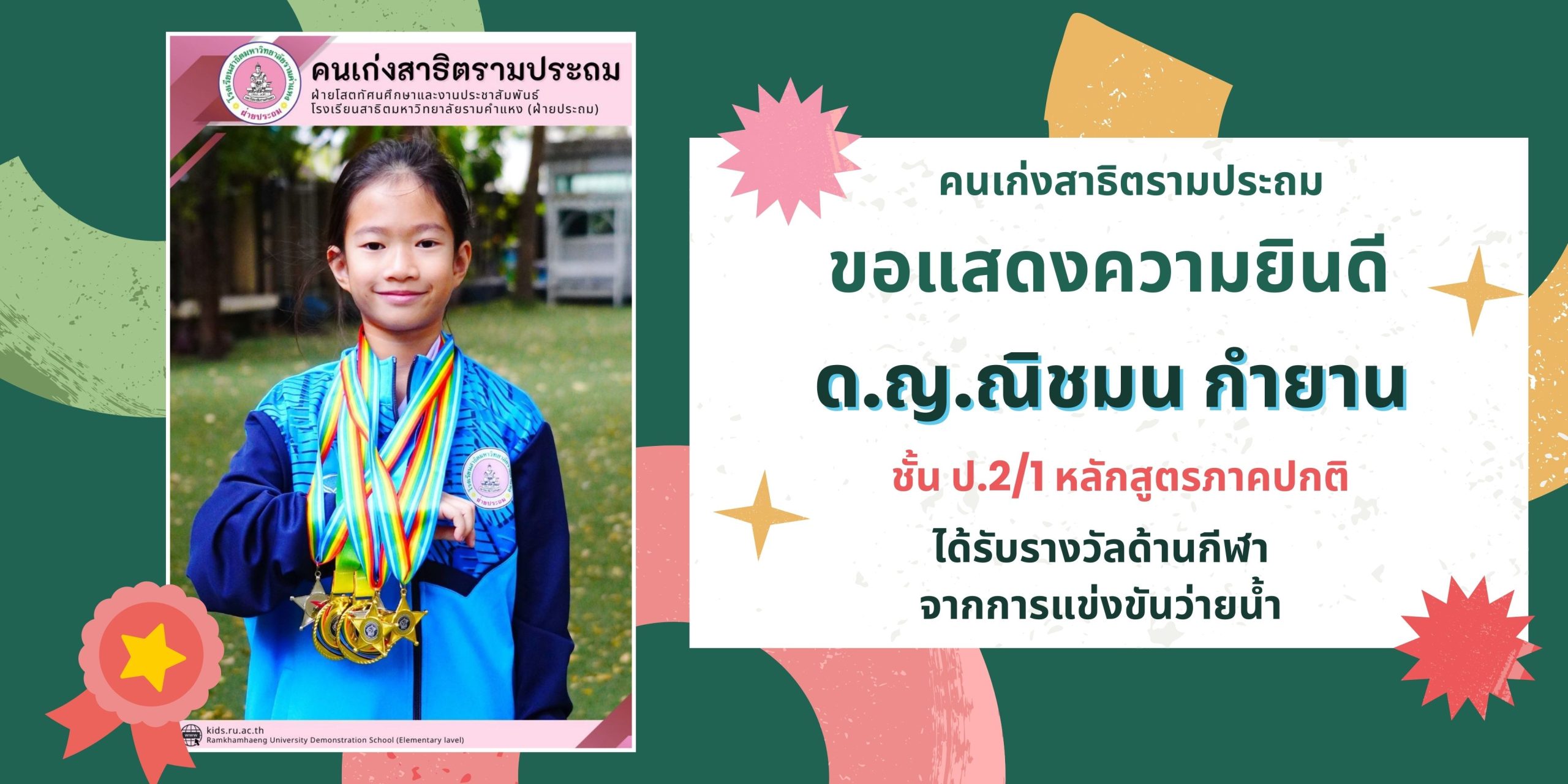 ได้รับรางวัล 1 เหรียญทอง รายการกรรเชียง 50 เมตร จากการแข่งขันว่ายน้ำ