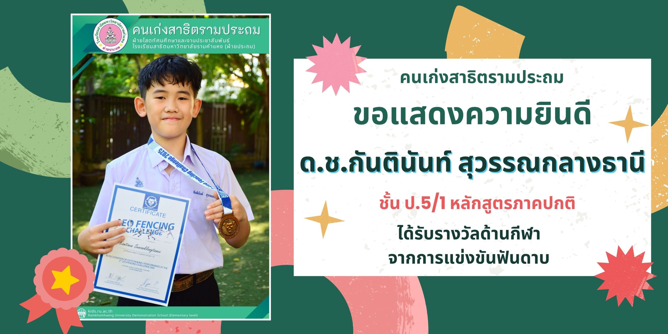 ได้รับรางวัลเหรียญทอง ประเภทการแข่งขัน: ดาบเซเบอร์ชาย รุ่นอายุไม่เกิน 10 ปี