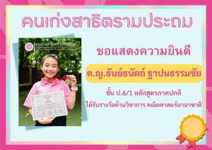 ด.ญ.ธันย์ธนัตถ์ ฐาปนธรรมชัย ชั้น ป.6/1 หลักสูตรภาคปกติ ได้รับรางวัลด้านวิชาการ คณิตศาสตร์นานาชาติ
